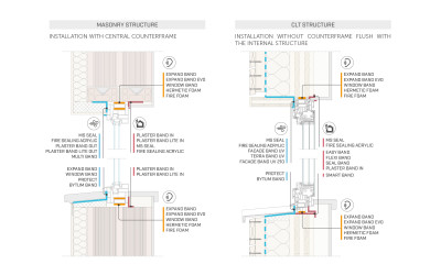 Das selbstausdehnende Band EXPAND BAND von Rothoblaas gewährleistet eine dauerhafte und über die Zeit unveränderte elastische Dehnung. Auf diese Weise bietet es Schutz vor Wasser, Staub und Wind. WINDOW BAND hat sogar eine dreifache Funktion: Es sorgt für die Abdichtung der Verbindungen von Türen und Fenstern gegen Luft und Schlagregen, wobei die thermoakustischen Eigenschaften über die gesamte Tiefe erhalten bleiben. Es handelt sich um ein selbstausdehnendes Band für Fenster- und Türrahmen: Mit nur einem Produkt können alle drei Ebenen abgedichtet werden.