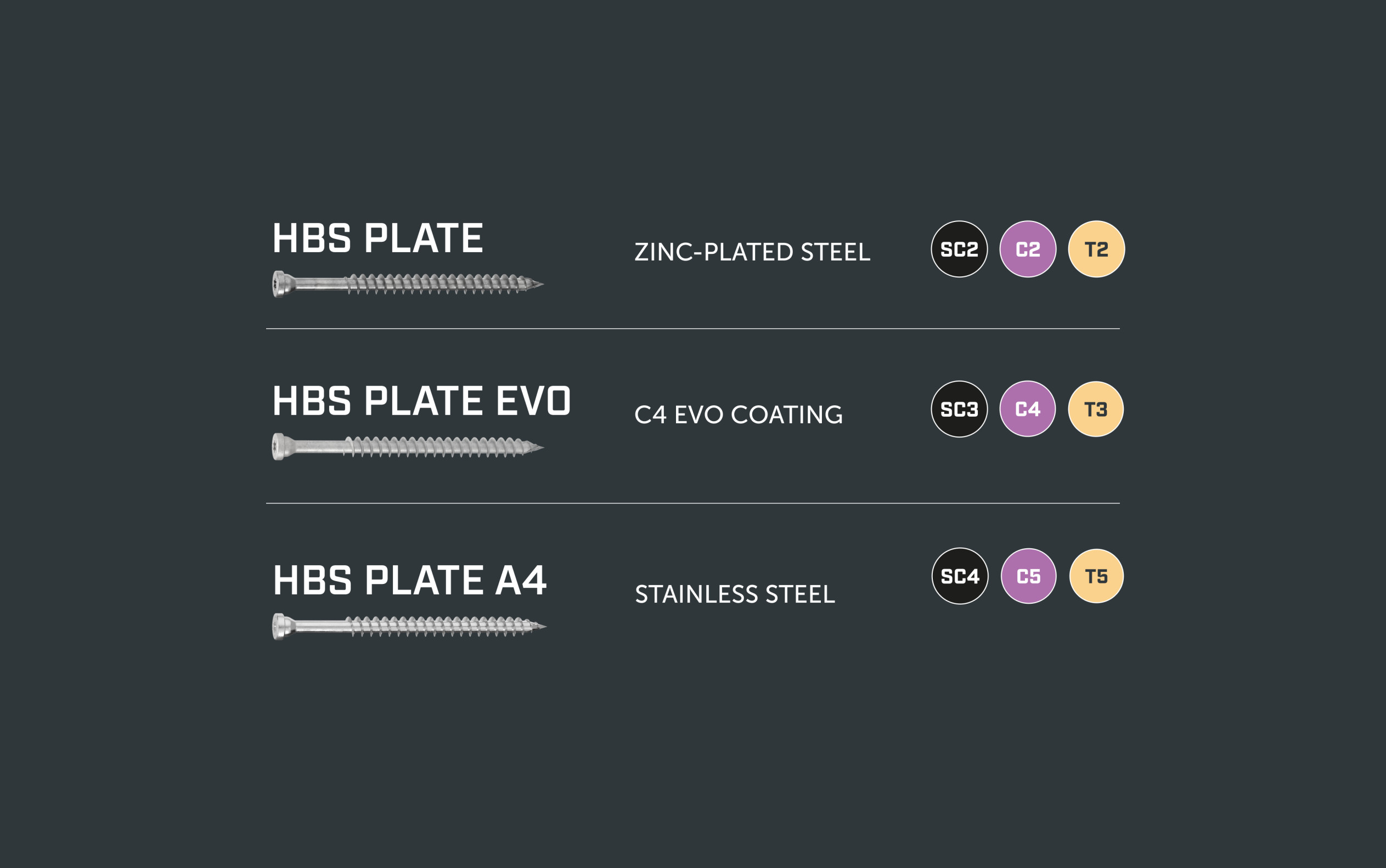 Die Produktreihe HBS PLATE umfasst drei Lösungskonzepte, um Festigkeit und Schutz bei allen Einsatzbedingungen zu gewährleisten: von verzinktem Stahl für trockene Umgebungen über die Beschichtung EVO Coating – konform mit AC257 und RISE-geprüft für C4-Szenarien – bis hin zu Edelstahl A4 für besonders aggressive Bedingungen.