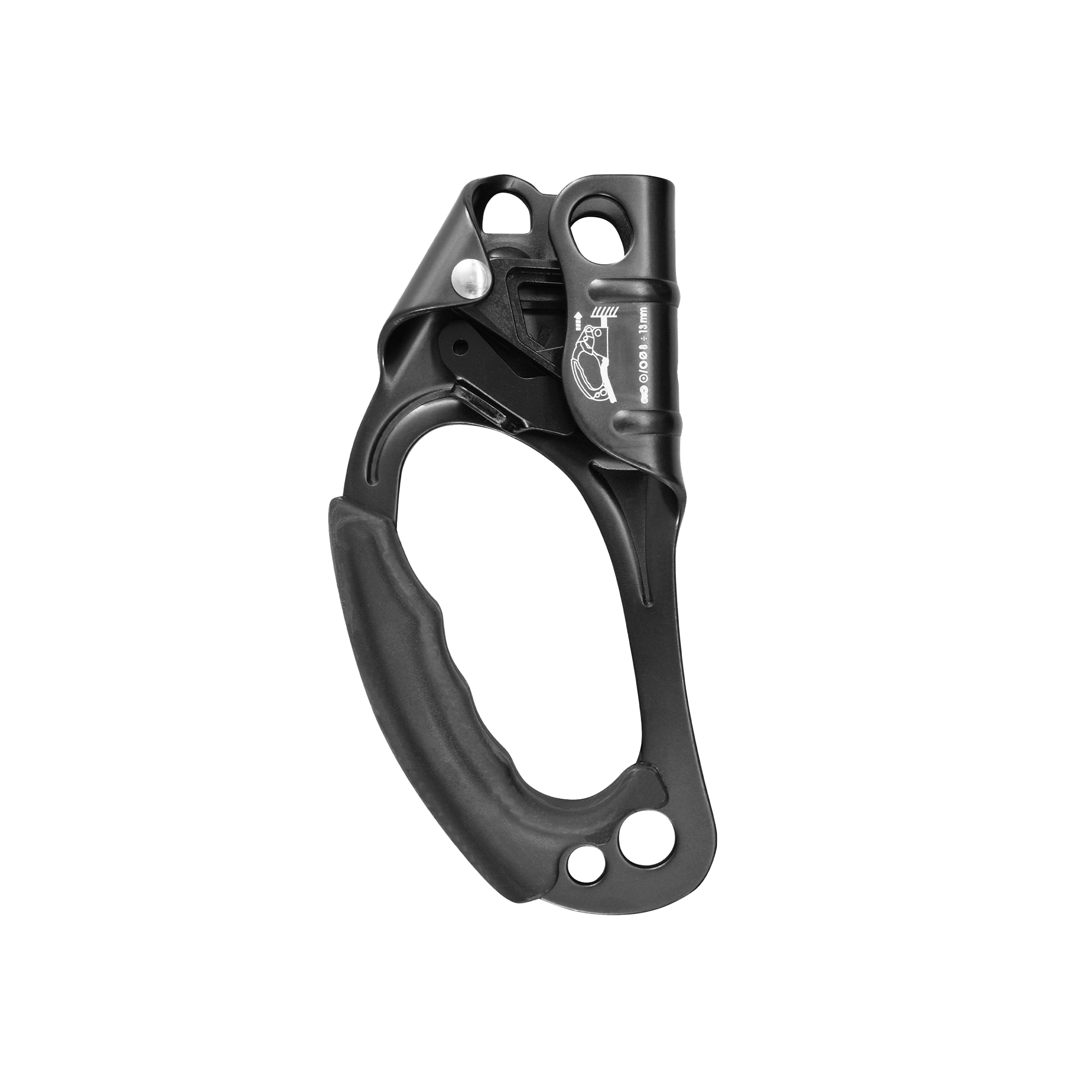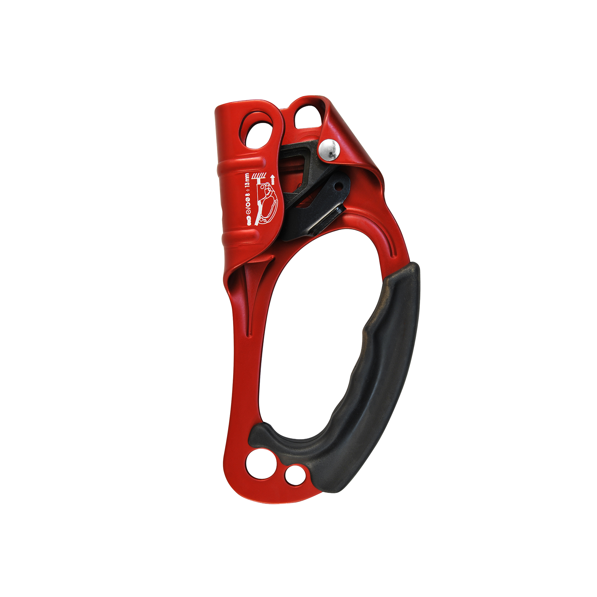 Steigklemme aus Aluminiumlegierung. Erhältlich in rechter und linker Ausführung, weist sie eine ausgezeichnete Blockierfähigkeit auch bei stark verschmutzten Seilen dank Ableitungsöffnungen an den Nocken und Backen auf.
