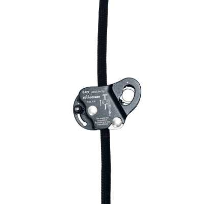 Fallschutzgerät zur einhändigen Bedienung, ermöglicht dem Arbeiter den Aufstieg und das Abseilen, sowie das Stoppen etwaiger Stürze aus der Höhe, Abrutschen auf geneigter Fläche oder unkontrolliertem Abseilen.