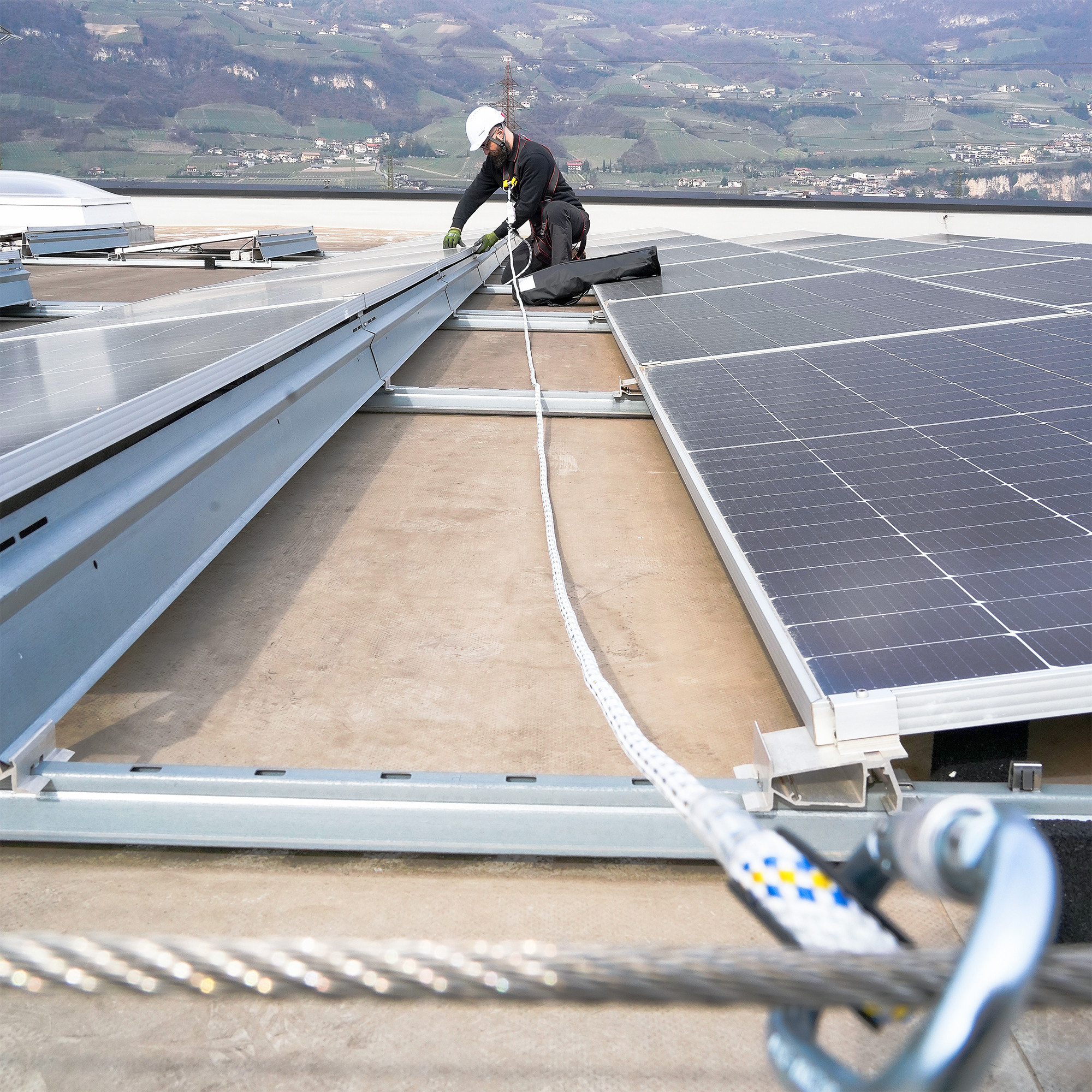 ROOF BASE ist das Absturzsicherungsset für jede Standardausrüstung für Arbeiten auf dem Dach; dazu gehören der Auffanggurt IRIS, LINOSTOP und das 10 m lange Seil mit verstellbarem mitlaufendem Auffanggerät und den Helm für arbeitssicherheit, industrie und bau POP und der halbrunde Karabiner in „D“-Form FAST LINK.