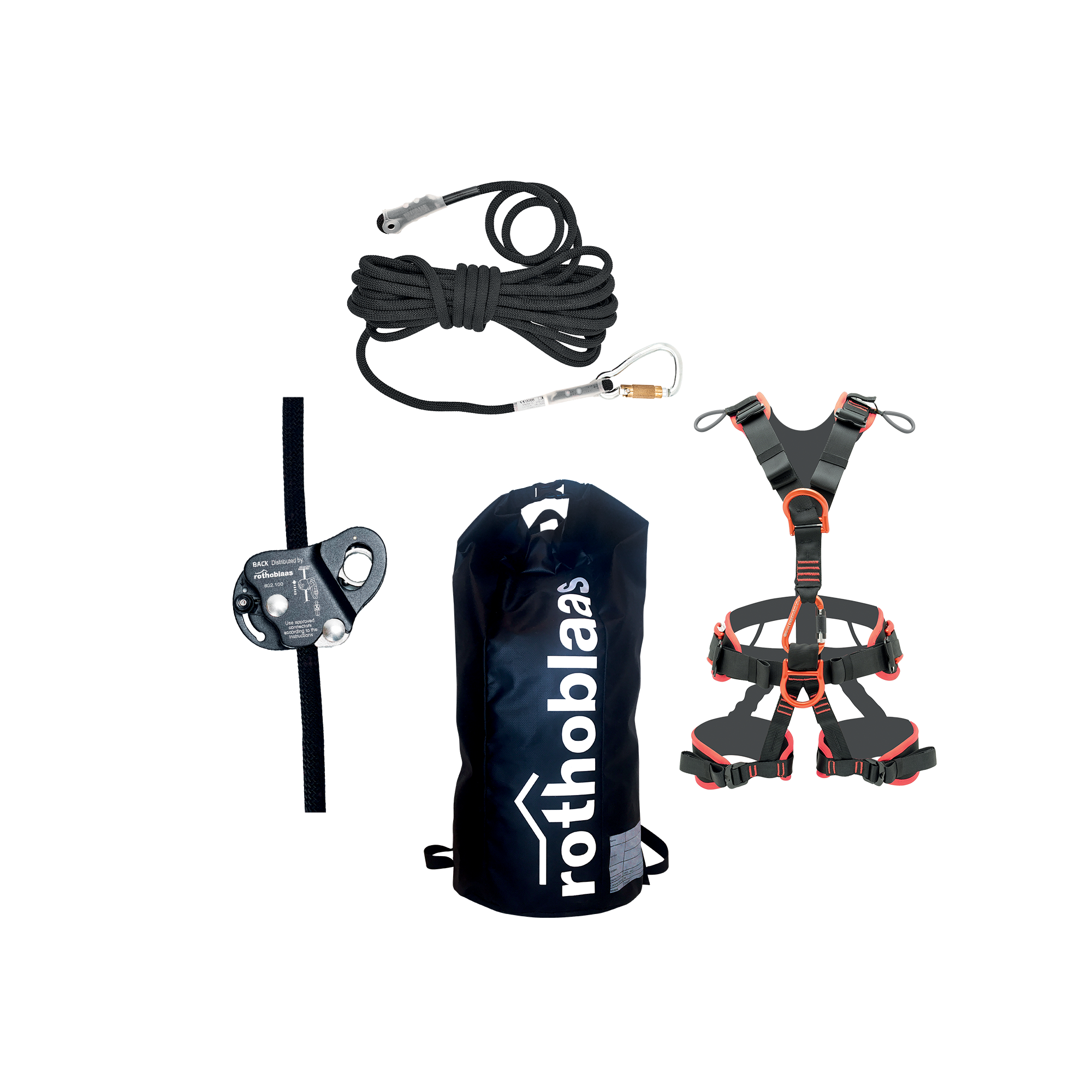 ROOF PRO ist das professionelle Set zur Absturzsicherung bei Arbeiten auf Dächern, das den Auffanggurt zur Absturzsicherung und Arbeitsplatzpositionierung SPARTA, das halbstatische 15 m lange Seil mit selbstverriegelndem Karabiner ROPE1 und das geführte abnehmbare Auffanggerät BACK umfasst.