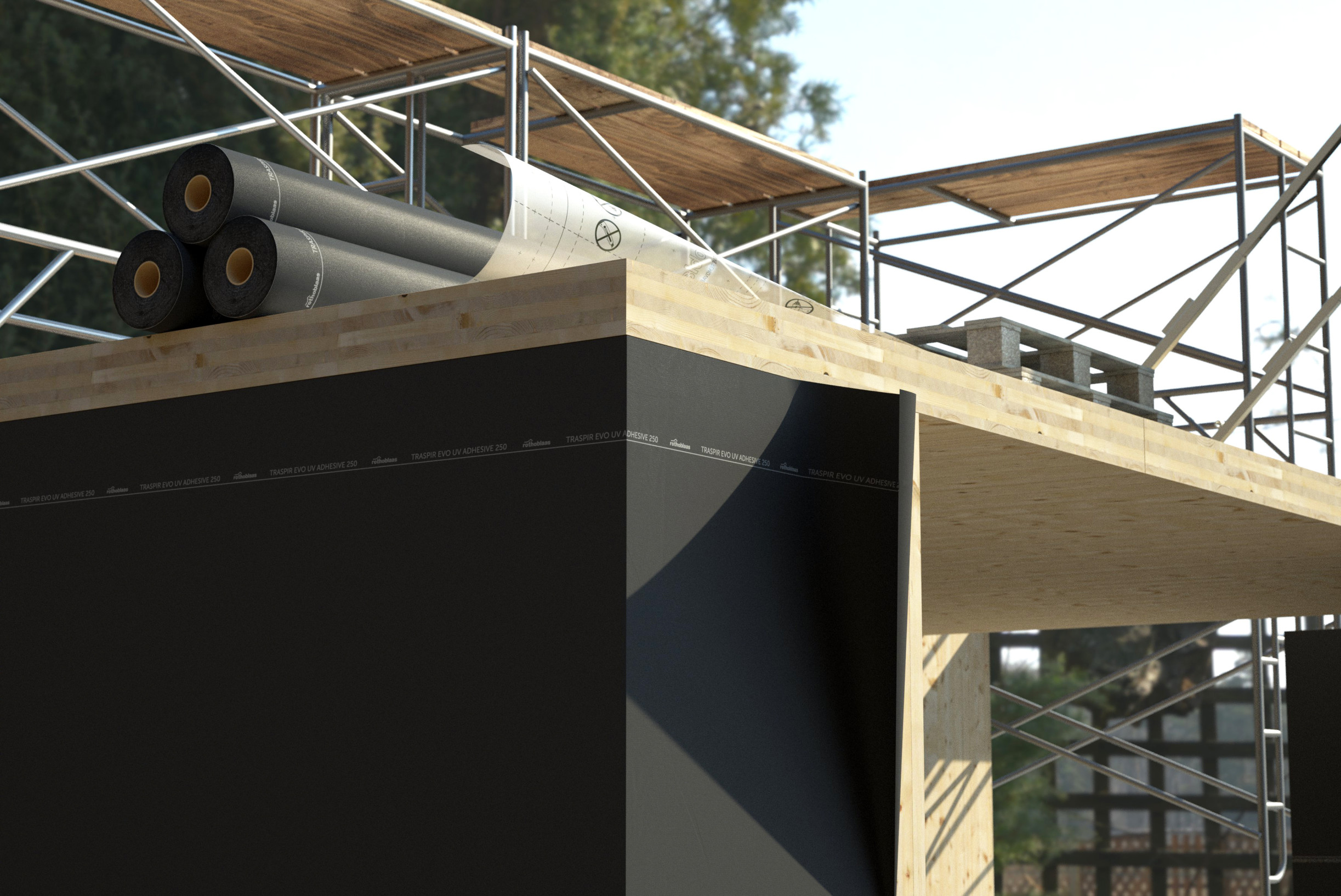 Die Klebefläche verhindert die Bildung von Luftströmungen hinter der Bahn bei vorübergehender Beschädigung oder fehlender Abdichtung. Die vollkommen selbstklebende Oberfläche der Bahn ermöglicht eine schnelle und sichere Montage: Sie eignet sich für die Vormontage im Werk und schützt die Elemente aus BSP beim Transport und während der Bauphasen.