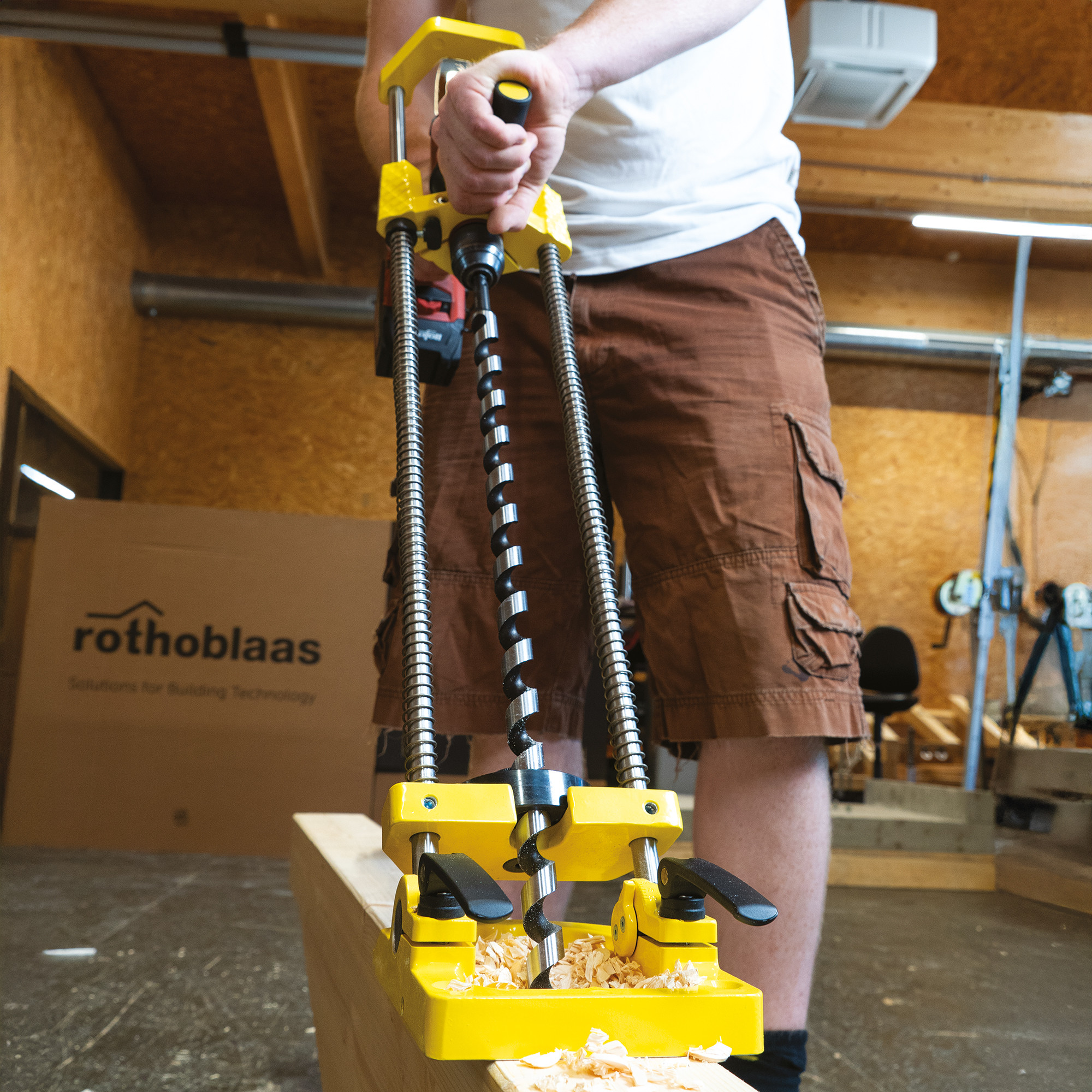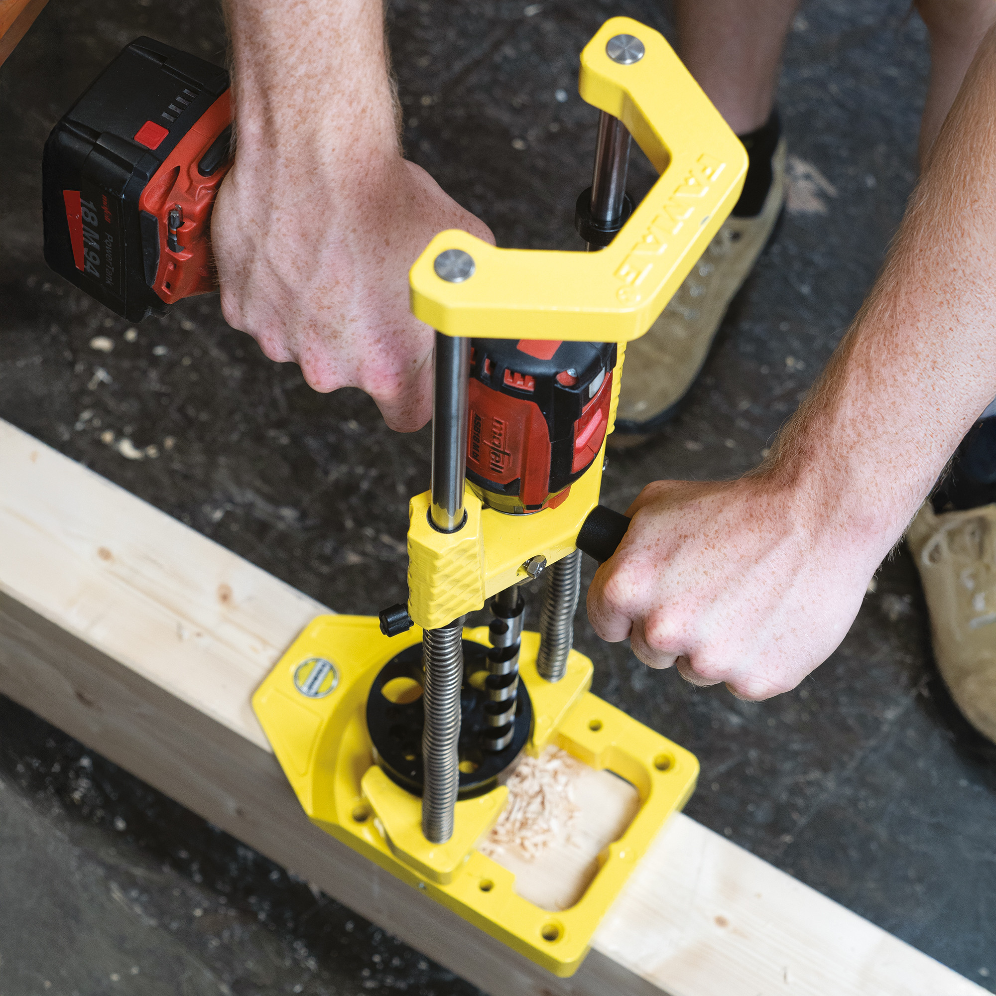 • Dank der einstellbaren Tiefenanschläge, der präzisen Führungsplatte und des zusätzlichen Stabilisierungselements werden die Löcher immer im perfekten Winkel gebohrt
