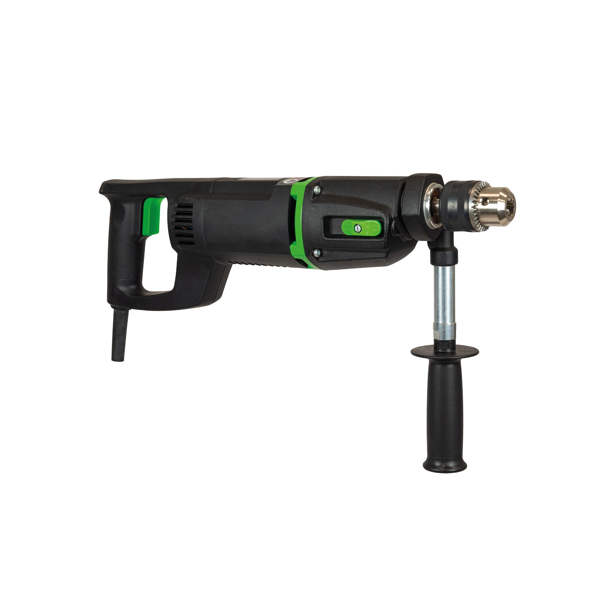 Ein elektronischer Schalter ermöglicht Soft-Starts für eine präzise Positionierung der Löcher. Der hintere Griff sorgt für Stabilität und Präzision beim Winkelbohren.
