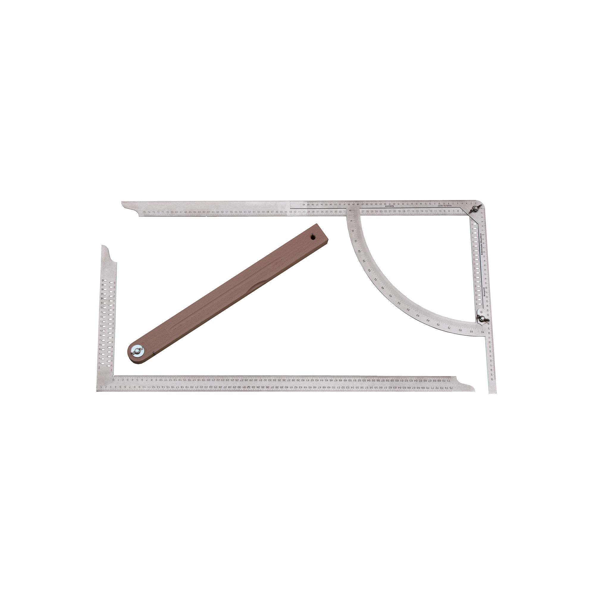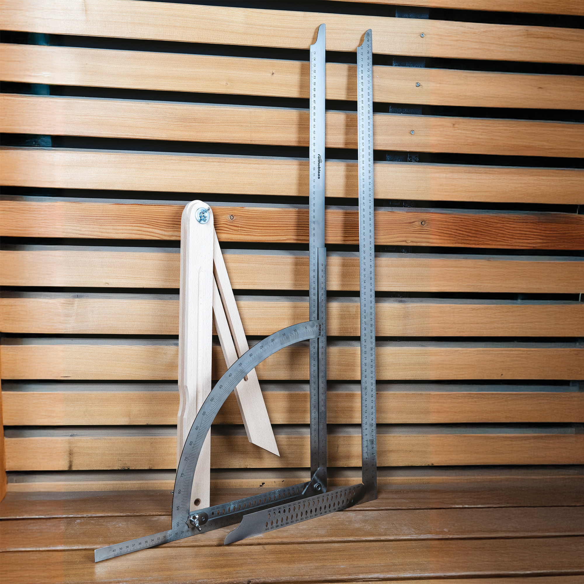 Drei klassische Anreißgeräte in einem Set: Zimmermannswinkel, Alphawinkel und Holzschmiege.
