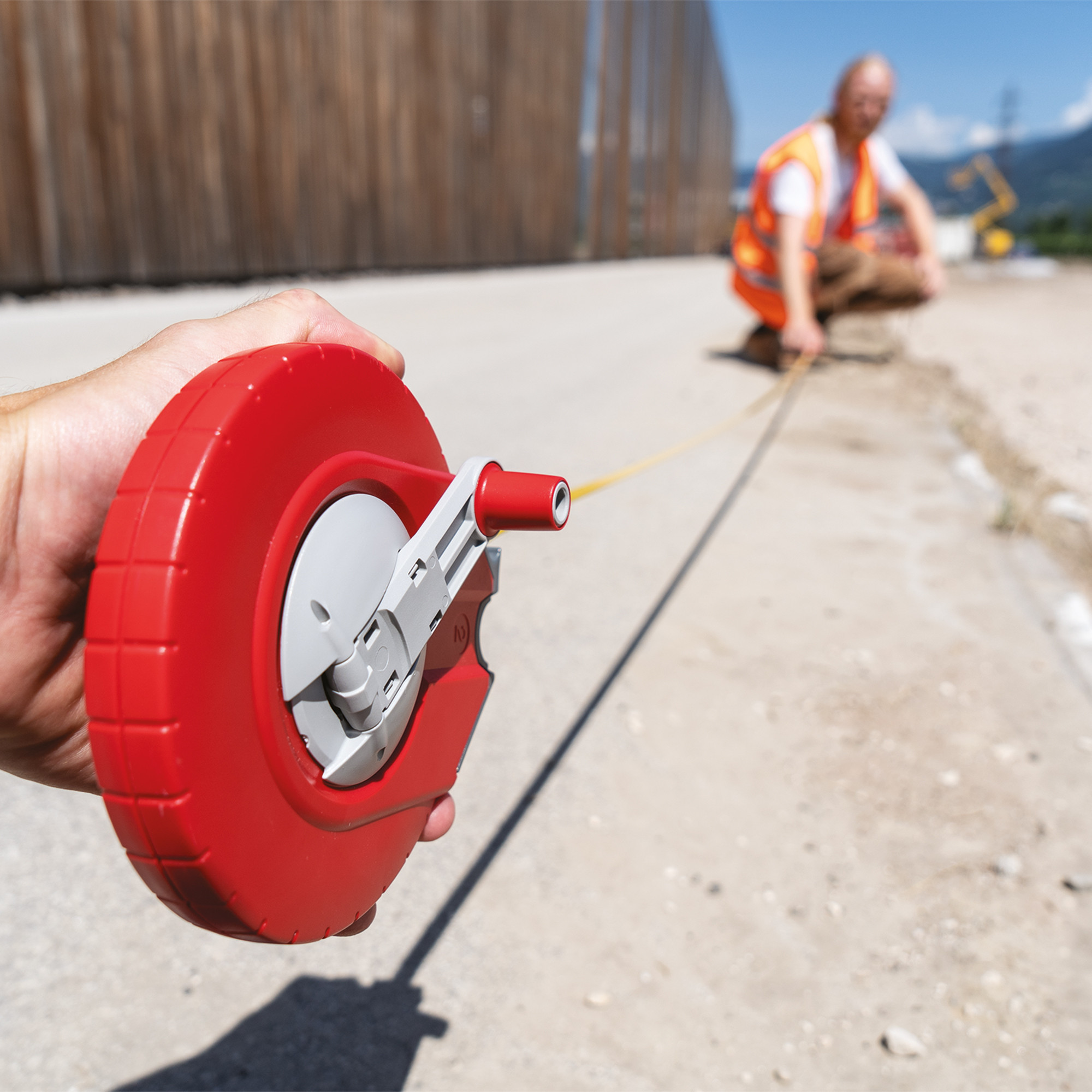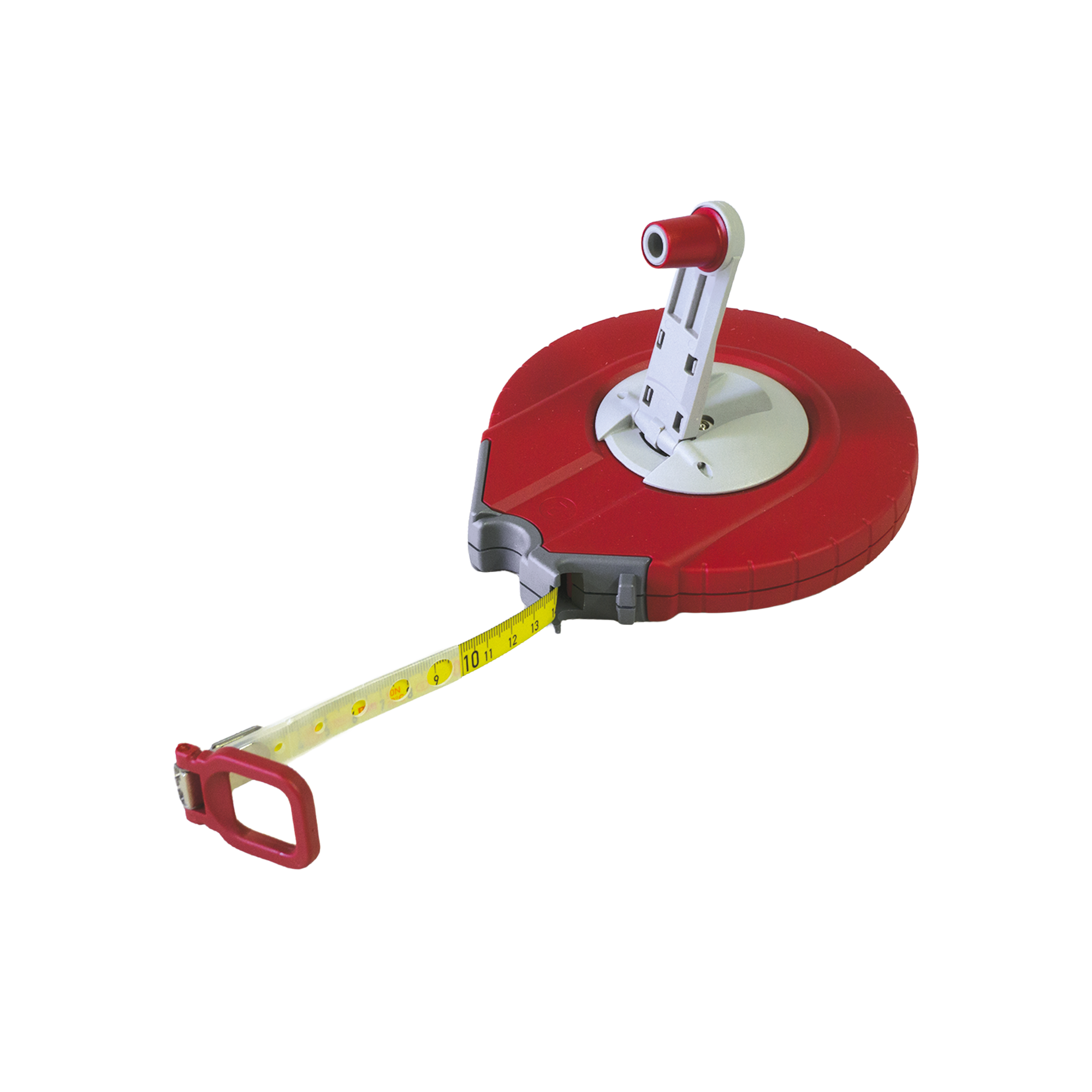 Rollmaßband (25 m), das sich um eine spezielle Aufrollvorrichtung wickelt und so Verwendung und Transport erleichtert.