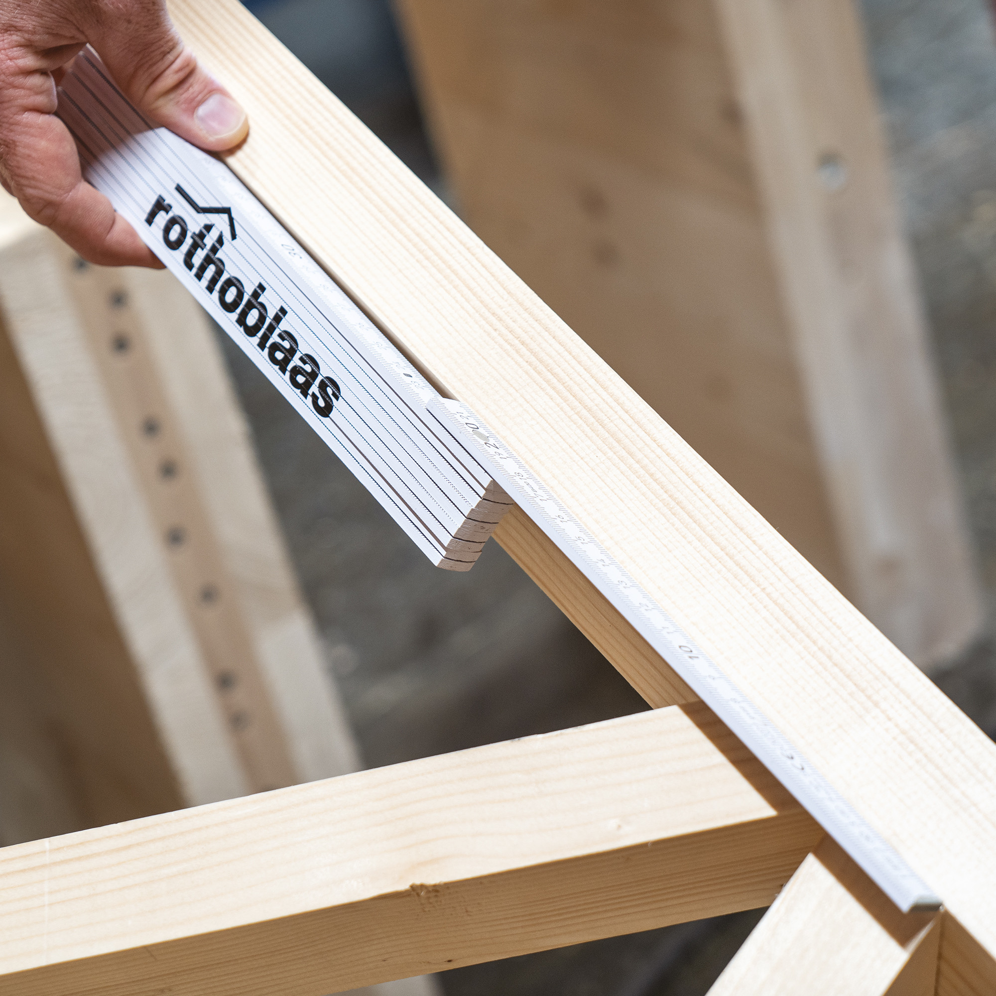 Zimmermannsmeterstab, bestehend aus mehreren Linealgliedern mit Scharnieren an den Enden. Die Glieder werden für einen praktischen Transport übereinandergelegt und bilden erneut aneinandergereiht und auseinandergeklappt einen einzigen Meterstab von 2 Metern Länge.