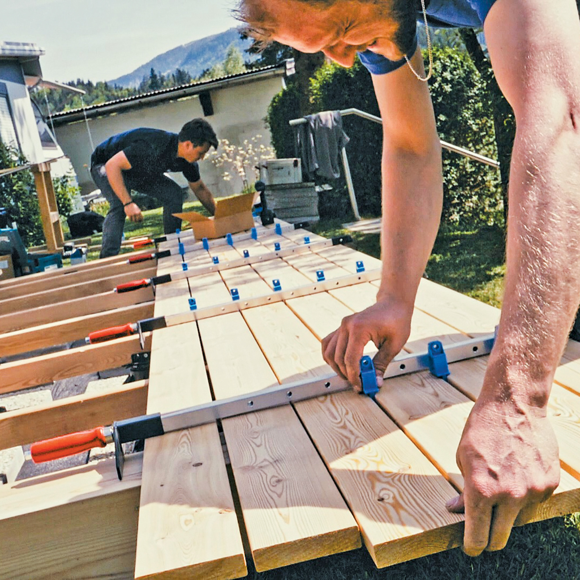Die Terrassenzwinge CRAB MAXI ist der perfekte Helfer, um je nach Dielenbreite 5 bis 7 Terrassendielen auf einmal zu spannen.