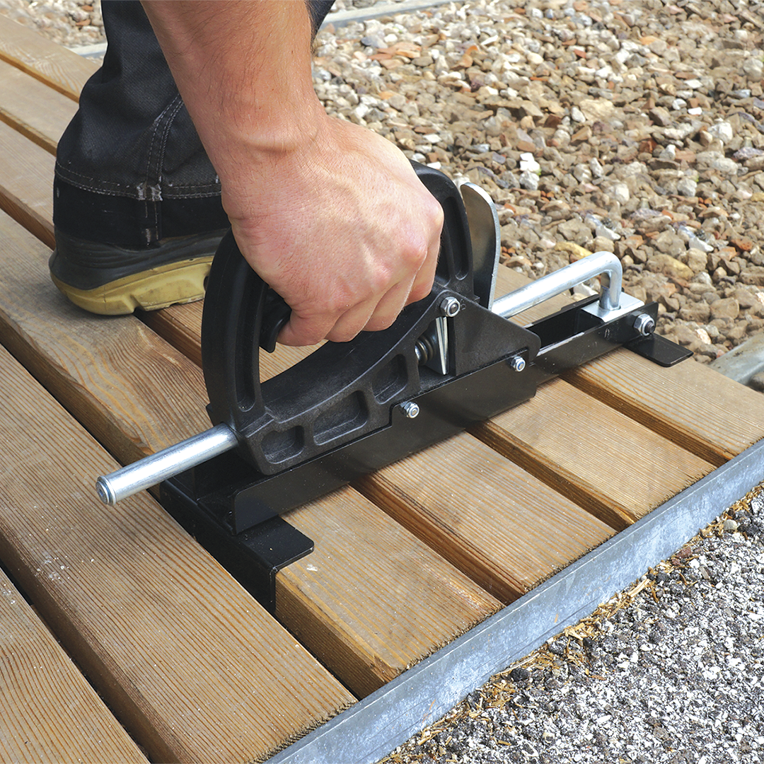 Die Terrassenzwinge CRAB MINI ist das ideale Werkzeug zum Spannen von Dielen bei der Herstellung von Holzterrassen.