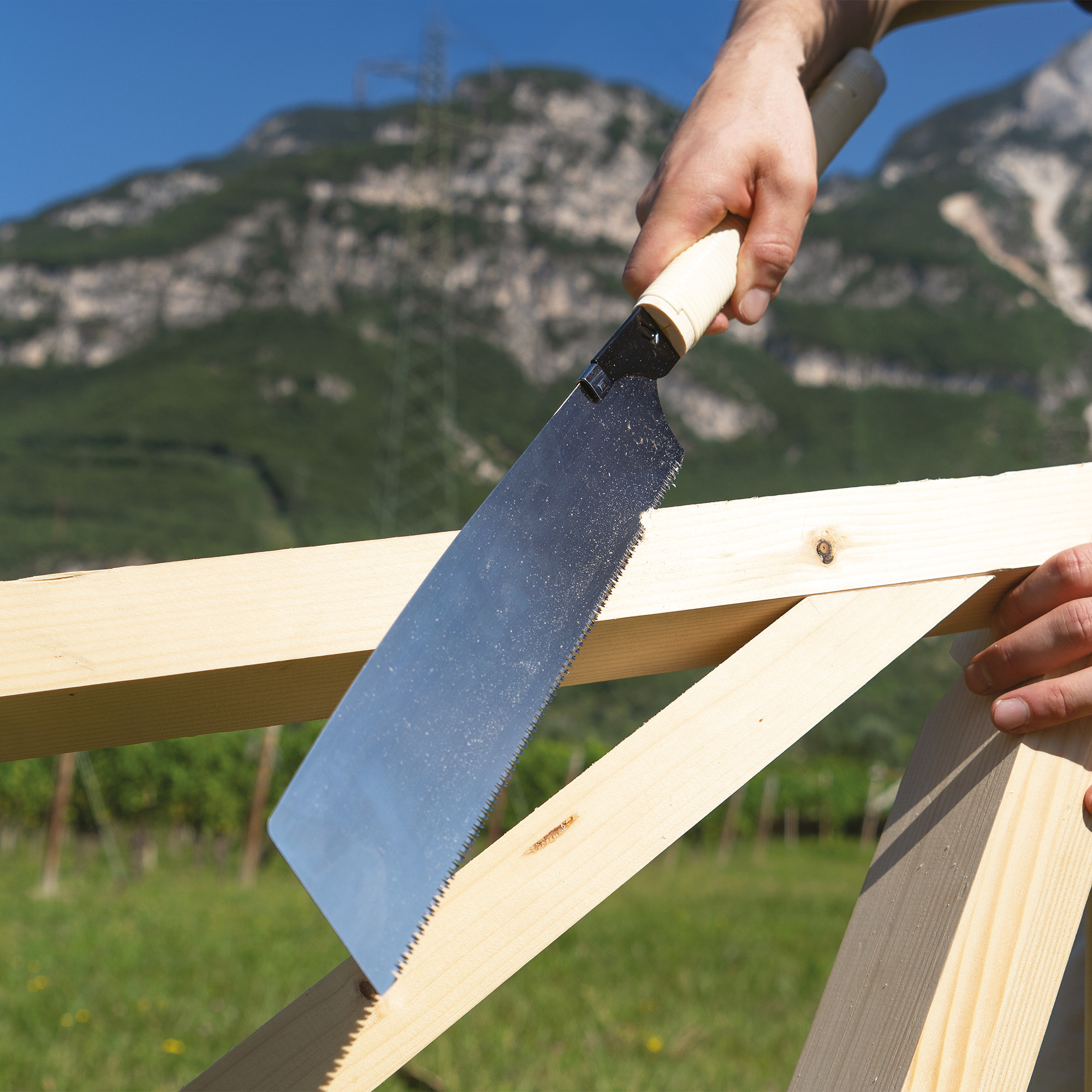 Zugsäge mit doppelseitiger Japan Verzahnung für präzise und pass- genaue Schnitte in Faserrichtungen und quer zur Faser in allen Holz- arten.
