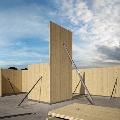 GIRAFFE wird als vorübergehende Stütze bei der BSP-Montage, aber auch für Rahmenelemente, Holzfertigteile, Stützen und Pfeiler aus Brettschichtholz und andere Objekte verwendet.