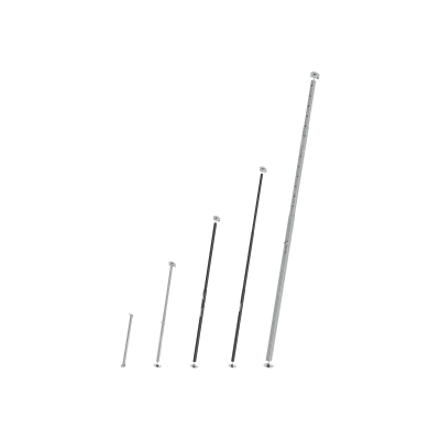 GIRAFFE ist in 4 Ausführungen mit unterschiedlichen Längen von 220 bis 600 cm erhältlich, um selbst bei Elementen, die sich auf bis zu zwei Stockwerke erstrecken, die Stützfunktion zu gewährleisten. GIR3000 (mit Schnellverschluss zur noch rascheren und präziseren Einstellung) und GIR4000 bestehen aus Stahl mit galvanischer Verzinkung; GIR2200 und GIR6000 sind aus extrudiertem Aluminium gefertigt.