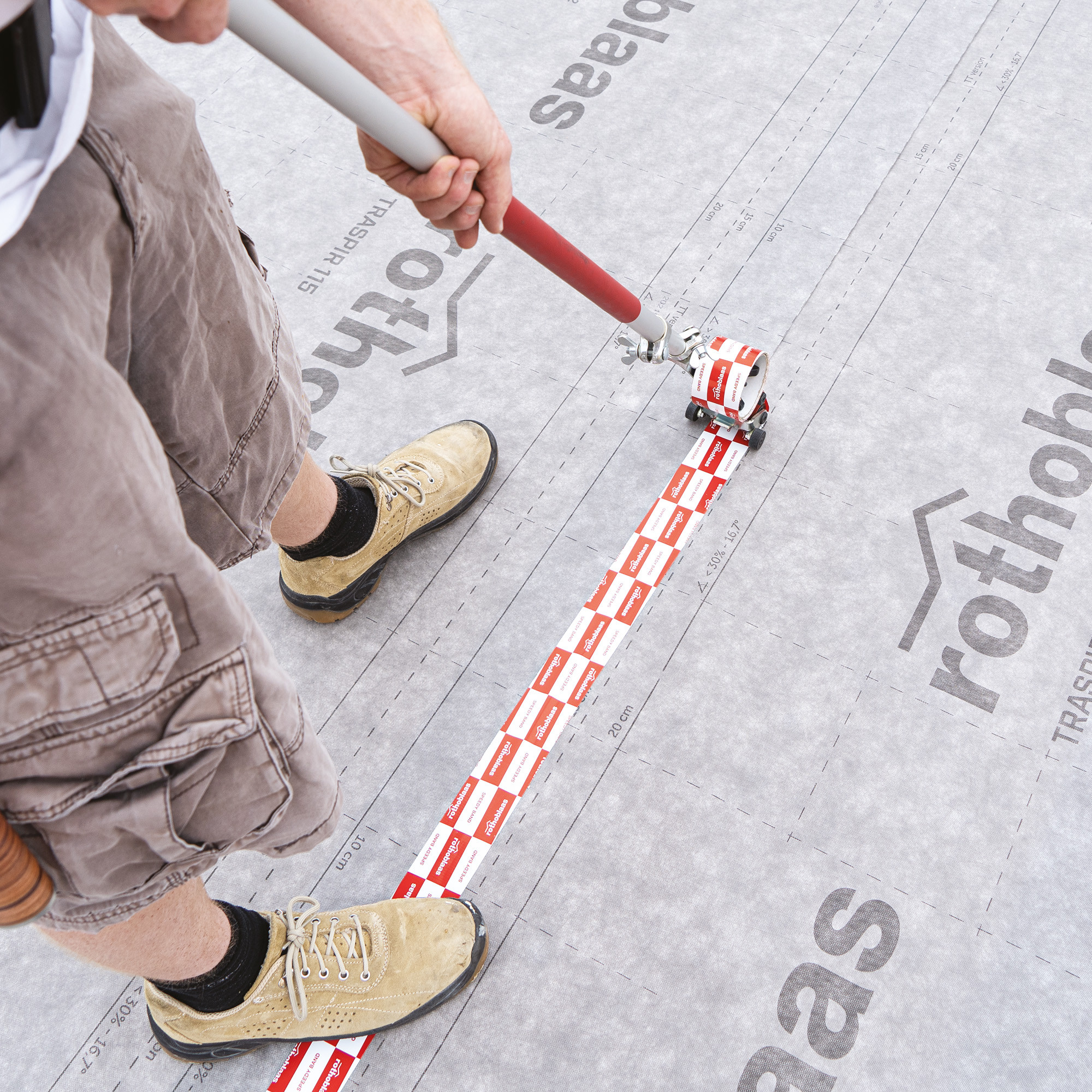 SPEEDY ROLL ist ein Bandapplikator mit langem Griff, der sich ideal zum Anbringen unseres SPEEDY BAND an Böden eignet, ganz bequem in aufrechter Position.