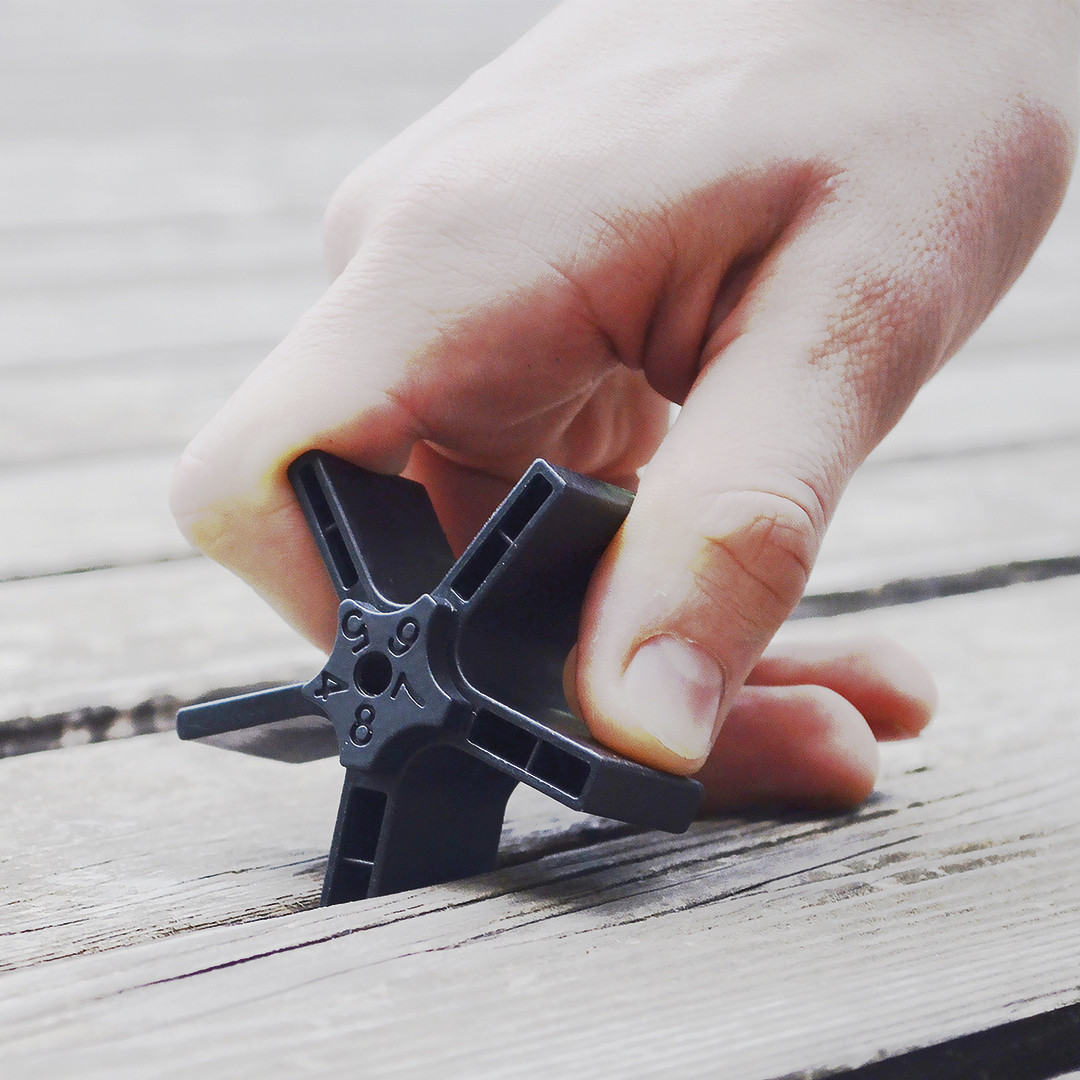 Der Distanzhalter-Stern STAR ist das einfache und praktische Instrument, um bei der Anfertigung von Holzterrassen Fugen in einheitlicher Breite zu erstellen.