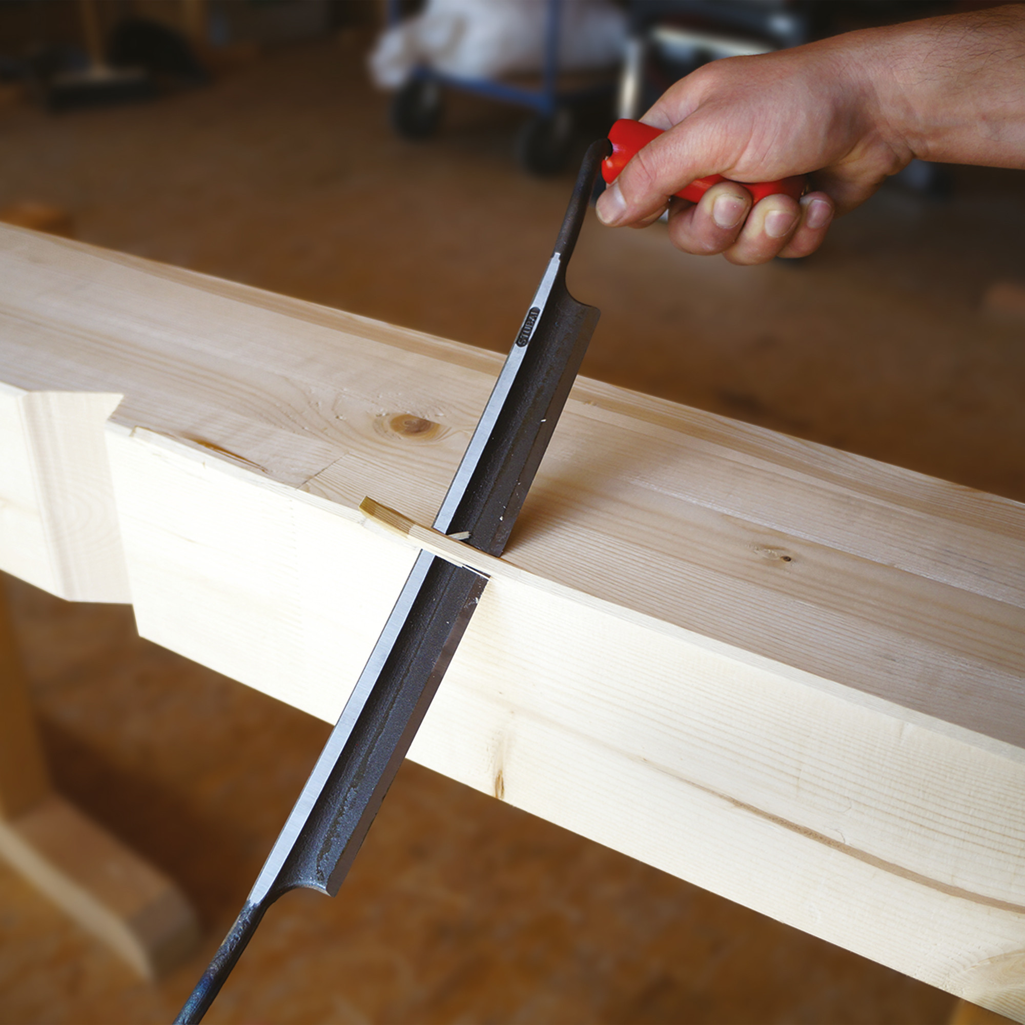Aus hochwertigem Stahl geschmiedet, gehärtet und geschliffen, Schnei- den mit Hohlschliff. Schneidenschutz aus PVC.