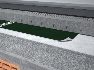 Es besteht aus Elastoplastomerbitumen, kaschiert mit schalldämmendem Polyesterfilz. Es ist auch mit frischem Beton kompatibel. Das Bitumen gewährleistet die Masse, die erforderlich ist, um die mechanische Festigkeit und den Schutz der Grundschicht zu gewährleisten und verhindert das Durchsickern des Betonestrichs.