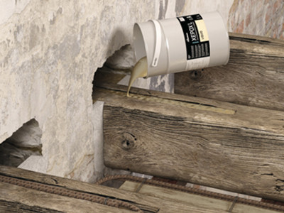 Flüssiger Zweikomponenten-Epoxydkleber für Konstruktionen, geeignet für Injektionen in vertikale Bohrungen und Fräsungen, nach vorherigem Versiegeln der Fugen.