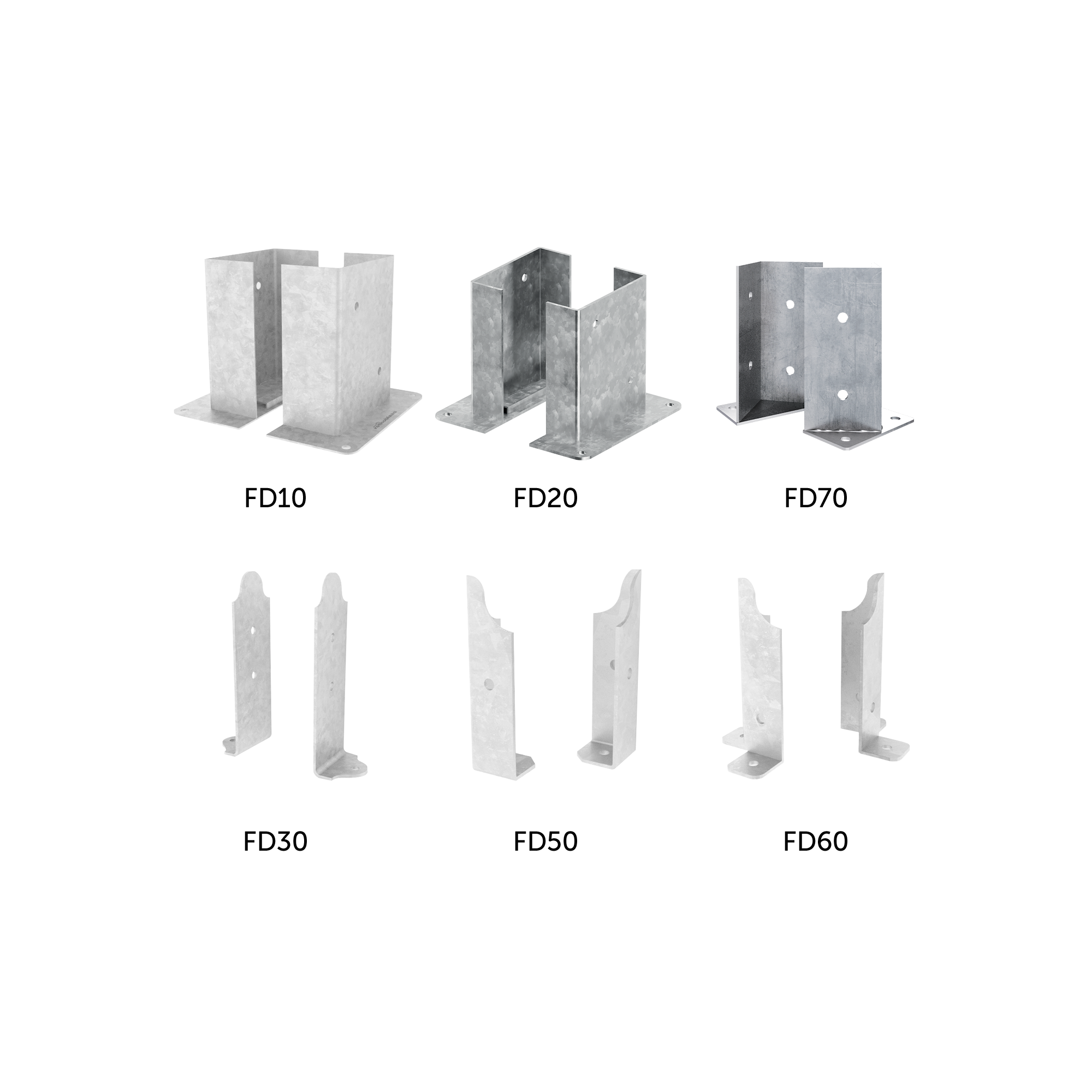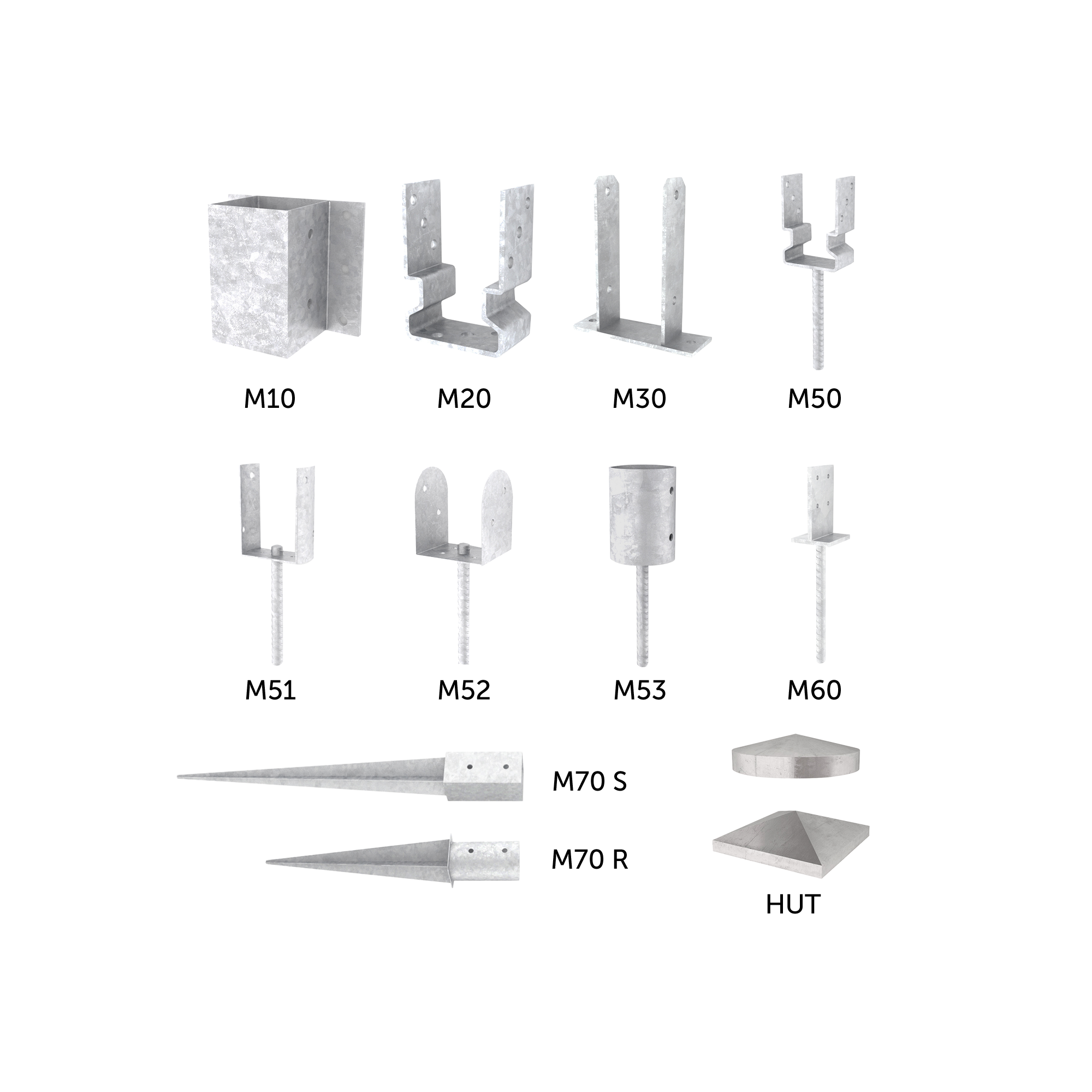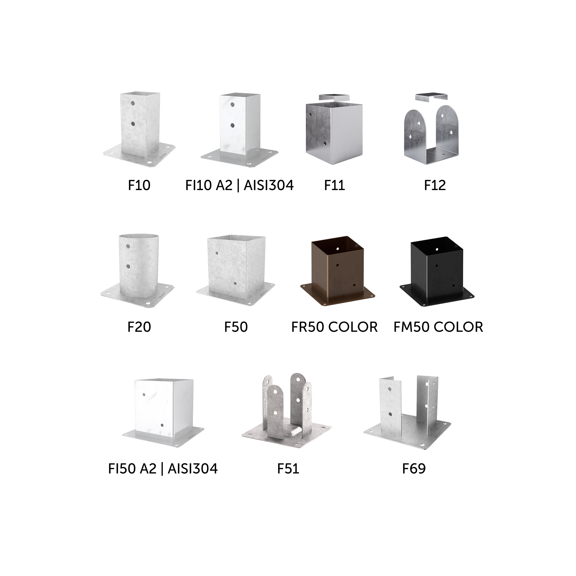 Alle Versionen sind für den Einsatz in den Nutzungsklassen 1, 2 und 3 geeignet; einige sind feuerverzinkt, andere aus Edelstahl A2 | AISI304 oder mit brauner oder graphitschwarzer Lackierung. Einige Ausführungen können auf Beton befestigt werden, während andere über Stangen zum Einbetonieren verfügen; wieder andere werden in den Boden eingeschlagen.