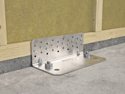 Der Winkelverbinder für Holz TITAN F wurde für die Befestigung an Randbalken oder an Balken von Rahmenkonstruktionen entwickelt. Er bietet zwei Befestigungsmöglichkeiten an Beton, um den Bewährungsstäben auszuweichen.